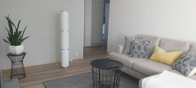 Poistin huoneistosta vanhat muovimatot ja hioin lattiat huolellisesti. Koko asuntoon asensin tyylikkään, tammen sävyisen vinyylilankkulattian. Maalasin kaikki seinäpinnat. Makuuhuoneen ja olohuoneen seiniin asensin tasoitetapetin ennen maalausta, jotta sain pinnat täysin sileiksi epätasaisuuksien vuoksi. Makuuhuoneen kaapit päivitin maalaamalla ne samaan sävyyn kuin keittiön kaapistot. Olohuoneeseen toteutin näyttävän tehosteseinän saman sävyvalinnan mukaisesti. Eteisessä vanha siivouskaapin uudistin maalaamalla, ja irtokaapin tilalle asennettiin käytännölliset kiinteät kaapit, jotka lisäävät säilytystilaa ja siisteyttä.